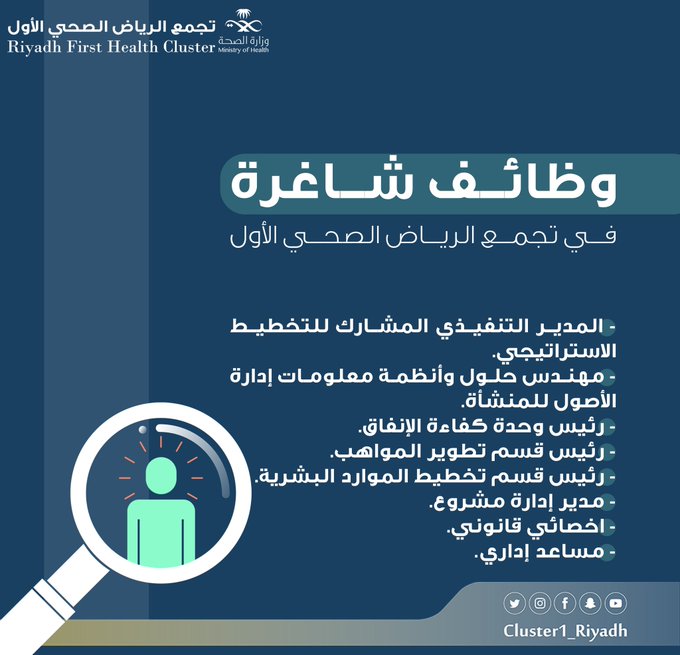 تجمع الرياض الصحي الأول يعلن عن توفر وظائف إدارية وتقنية ومالية شاغرة