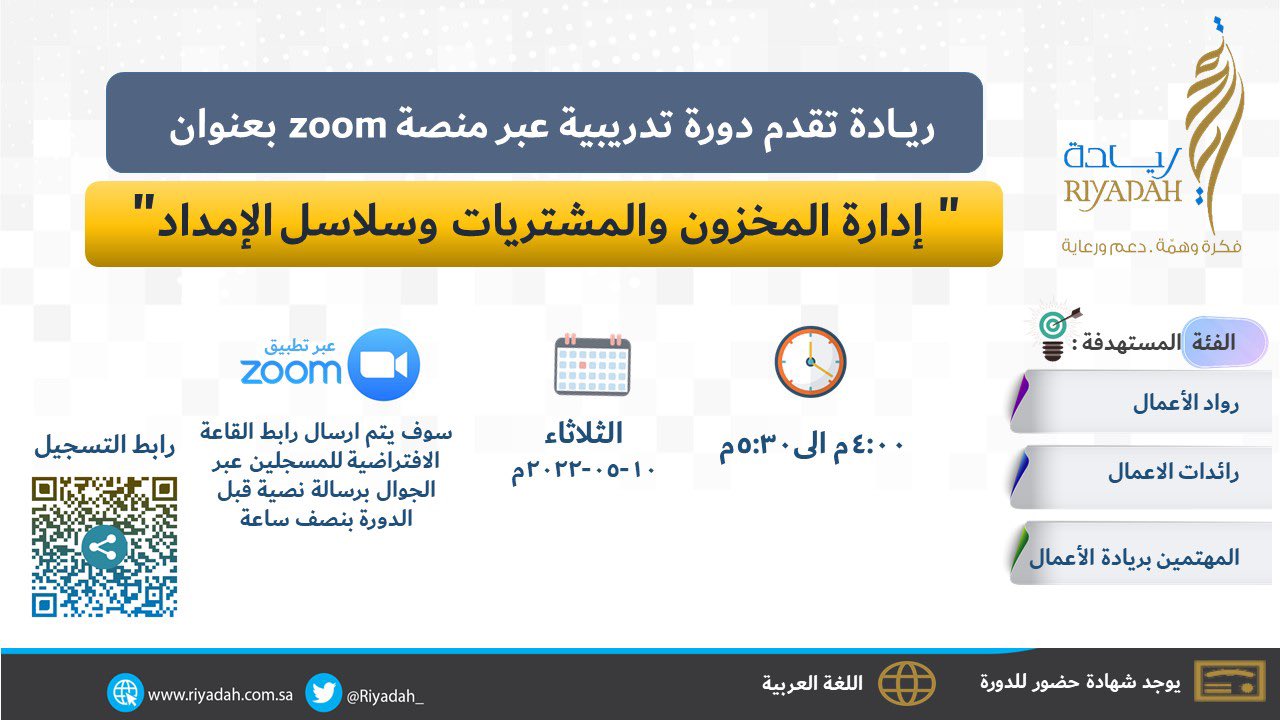 معهد ريادة الأعماليعلن (معهد ريادة الأعمال الوطني) عبر حسابه الرسمي على (تويتر) عن إقامة دورة تدريبية مجانية عن بُعد للمهتمين بريادة الأعمال بعنوان (إدارة المخزون والمشتريات وسلاسل الإمداد ) ضمن برامج ريادة لتطوير مهارات رواد الأعمال، وذلك وفقاً للتفاصيل والشروط الآتية.