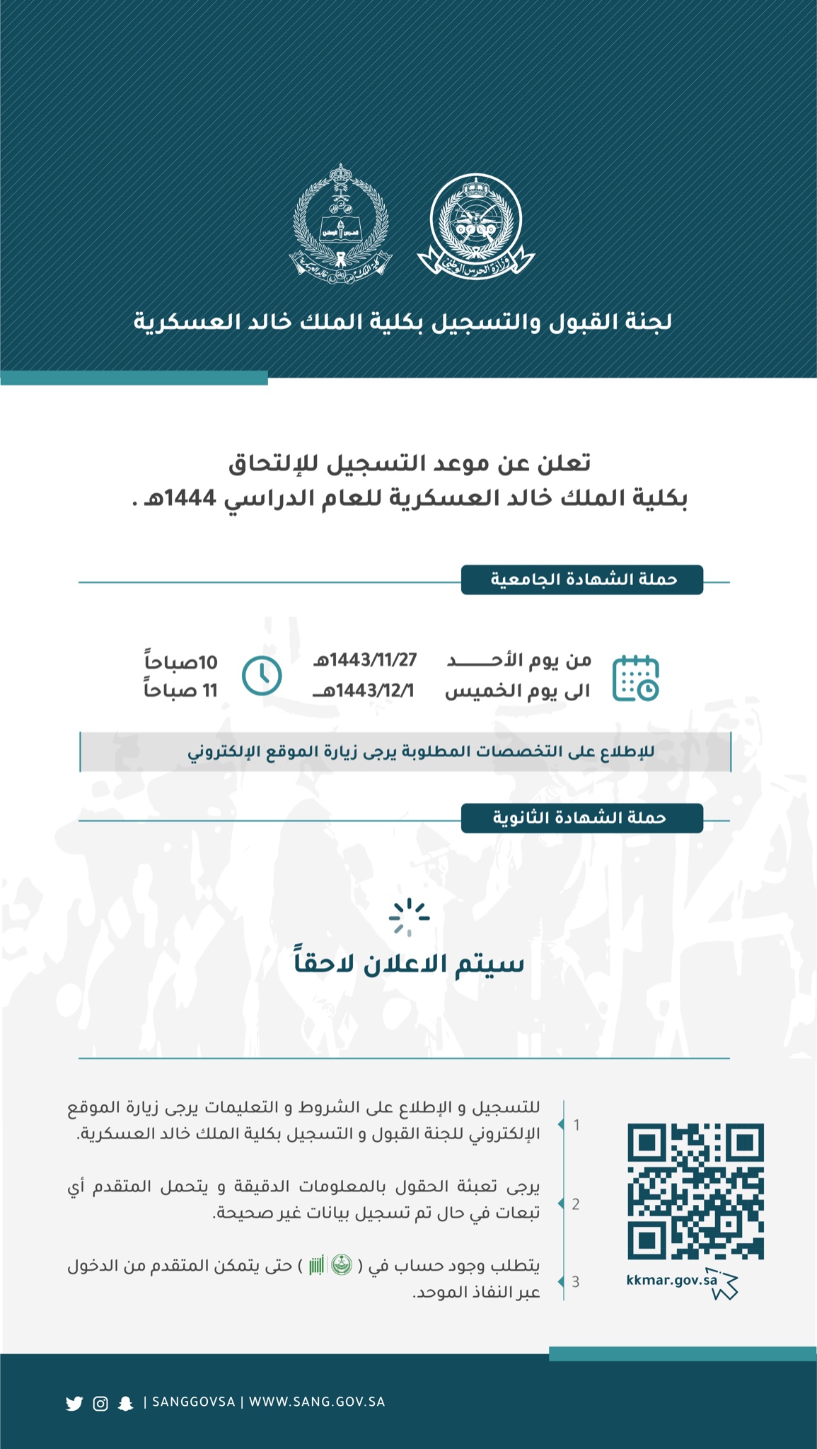 تعلن لجنة القبول والتسجيل بوزارة الحرس الوطني عن فتح باب القبول و التسجيل بكلية الملك خالد العسكرية للعام الدراسي 1444 هـ لدورة تأهيل الضباط الجامعيين لحملة الشهادة الجامعية، ولحملة الشهادة الثانوية، وذلك من خلال التفاصيل الآتية.