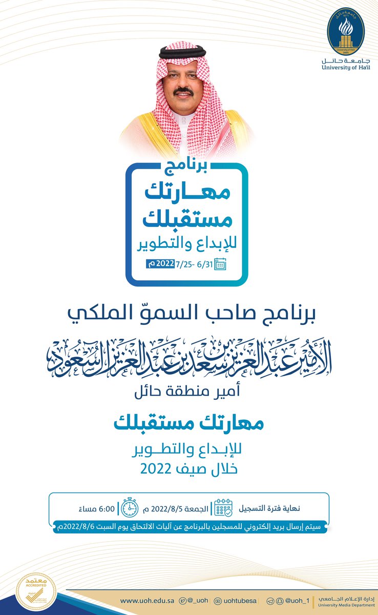 وظيفتك عليناتعلن ( جامعة حائل ) عبر حسابها الرسمي ( تويتر ) عن انطلاق برنامج صاحب السموّ الملكي الأمير عبدالعزيز بن سعد بن عبدالعزيز آل سعود، أمير منطقة حائل، "مهارتك مستقبلك" للإبداع والتطوير، الذي يتضمن مجموعة من الدورات التدريبية المجانية التي تقدم (عن بُعد) و (حضوريا) للرجال والنساء، وذلك وفقاً للتفاصيل والشروط الآتية.