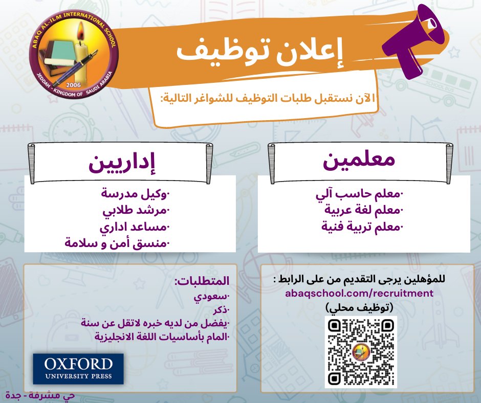 مدرسة عبق العلم العالميةتعلن ( مدرسة عبق العلم العالمية ) عبر حسابها الرسمي ( تويتر ) عن توفر وظائف تعليمية وإدارية للعام الدراسي 1444هـ للعمل في ( جدة )، واشترطت ان يكون المتقدم سعودي الجنسية، وذلك وفقاً للتفاصيل والشروط الآتية.