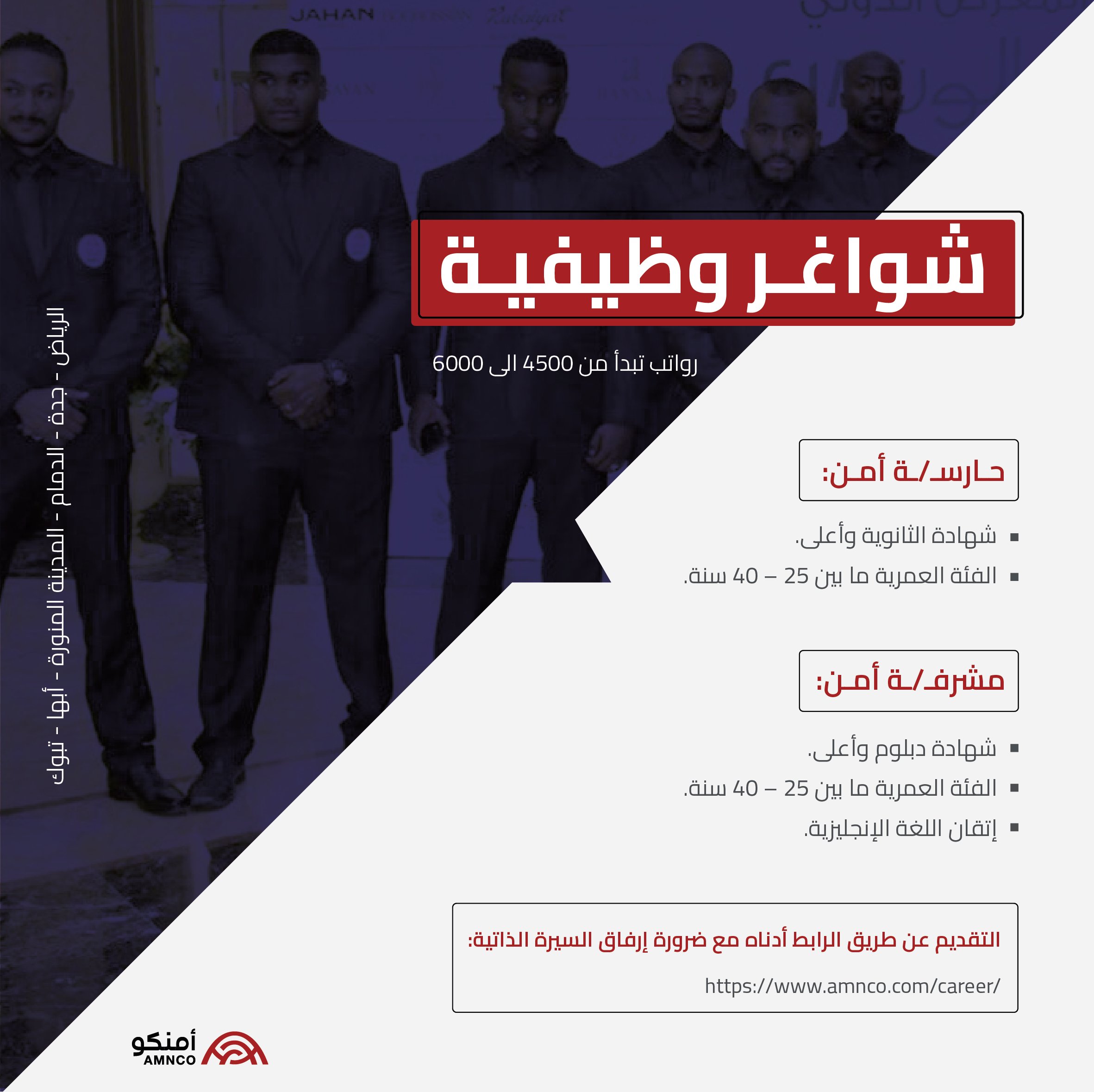 شركة أمنكو لخدمات الأمن والسلامةتعلن ( شركة أمنكو لخدمات الأمن والسلامة ) عبر حسابها الرسمي ( تويتر ) عن فتح باب التوظيف (رجال / نساء) لحملة الثانوية فأعلى بعدة مدن للعمل في ( الرياض، جدة، الدمام، المدينة المنورة، أبها، تبوك )، واشترطت ان يكون المتقدم سعودي الجنسية، وذلك وفقاً للتفاصيل والشروط الآتية.