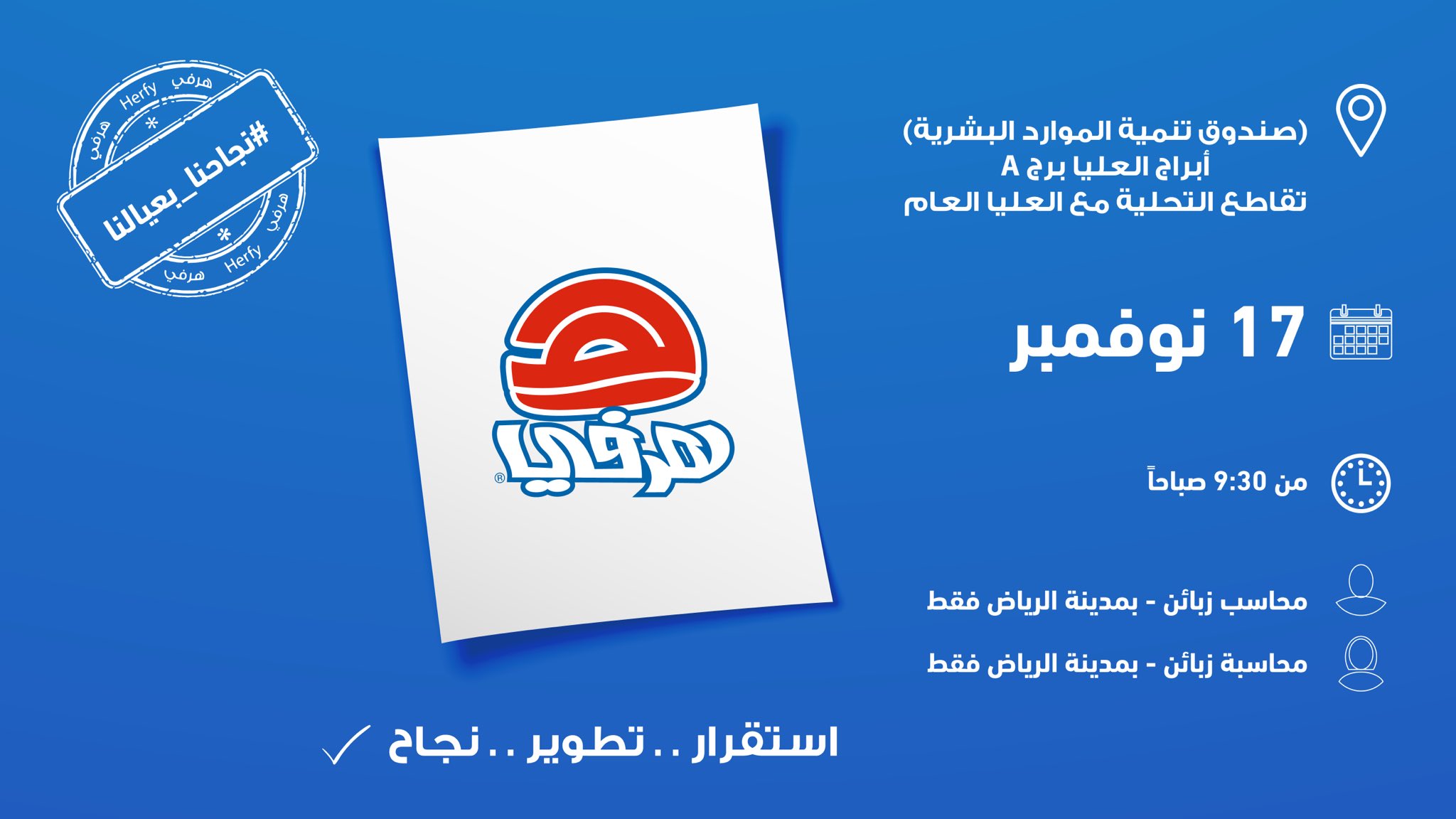 تعلن ( شركة هرفي للخدمات الغذائية ) عبر حسابها الرسمي (تويتر ) عن فتح باب التوظيف لإستقطاب الكفاءات السعودية بالتعاون مع صندوق تنميه الموارد البشريه - هدف لمختلف المؤهلات (رجال / نساء) في ( مدينة الرياض )، واشترطت ان يكون المتقدم سعودي الجنسية، وذلك وفقاً للتفاصيل والشروط الآتية.