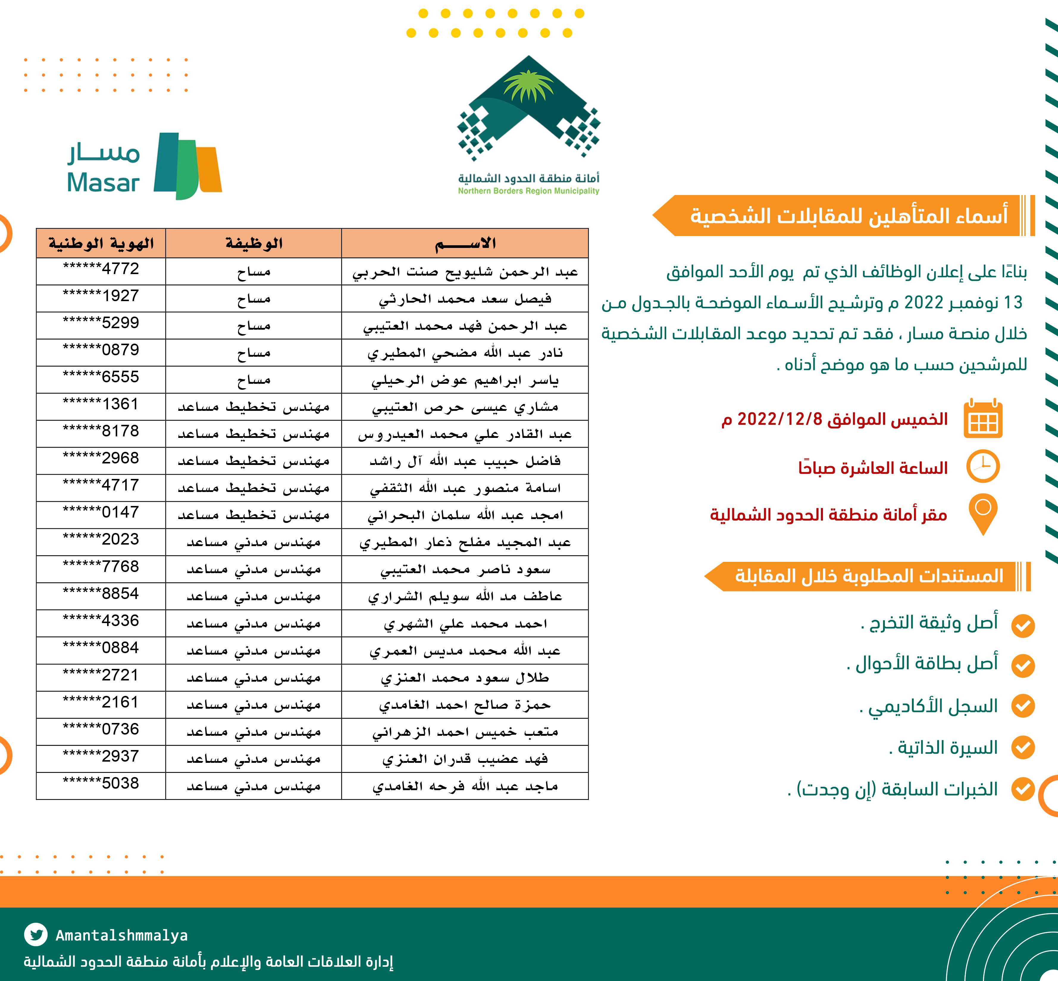 وظيفتك عليناتعلن ( أمانة منطقة الحدود الشمالية ) عبر حسابها الرسمي ( تويتر ) بناءًا على إعلان الوظائف الذي تم يوم الأحد 13 نوفمبر 2022م وترشيح الأسماء الموضحة من خلال منصة مسار، فقد تم تحديد موعد المقابلات الشخصية للمرشحين حسب ما هو موضح أدناه، وذلك وفقاً للتفاصيل والشروط الآتية.