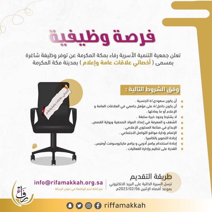 جمعية التنمية الأسرية بمكة المكرمةتعلن (جمعية التنمية الأسرية) عبر حسابها الرسمي (تويتر) عن توفر وظائف علاقات عامة وإعلام شاغرة لحملة المؤهلات الجامعية (نساء / رجال) للعمل في (مكة المكرمة)، وذلك وفقاً للتفاصيل والشروط الآتية.