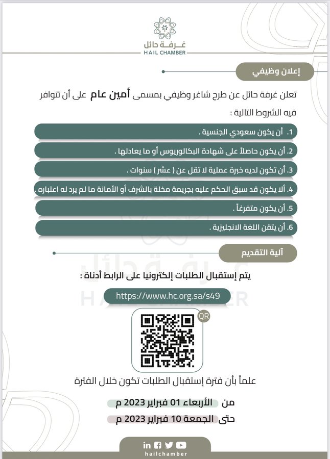 غرفة حائلتعلن (غرفة حائل) عبر حسابها الرسمي (تويتر) عن توفر وظائف إدارية شاغرة لحملة البكالوريوس فما فوق (نساء / رجال) للعمل في (حائل)، واشترطت أن يكون المتقدم سعودي الجنسية، وذلك وفقاً للتفاصيل والشروط الآتية.