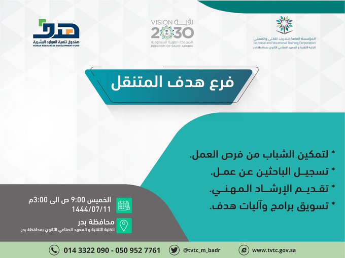 المؤسسة العامة للتدريب التقني والمهنيتعلن (الكلية التقنية للبنين والمعهد الصناعي الثانوي ببدر) عبر حسابها الرسمي (تويتر) عن توفر برامج تدريبية للخريجين الباحثين عن العمل بالتعاون مع (فرع هدف المتنقل) لتمكينهم من الحصول على الفرص الوظيفية في (المدينة المنورة)، واشترطت أن يكون المتقدم سعودي الجنسية، وذلك وفقاً للتفاصيل والشروط الآتية.