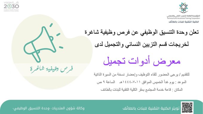 المؤسسة العامة للتدريب التقني والمهنيتعلن (الكلية التقنية للبنات بالطائف) عبر حسابها الرسمي (تويتر) عن توفر فرص وظيفية في لقاء التوظيف الذي تقيمه الكلية لخريجات قسم (التجميل والتزيين النسائي) بالتعاون مع (معرض لبيع أدوات التجميل) للعمل في (الطائف)، واشترطت أن يكون المتقدم سعودي الجنسية، وذلك وفقاً للتفاصيل والشروط الآتية.