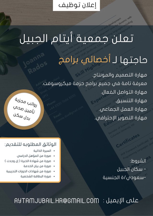 جمعية أيتام الجبيل تعلن توظيف مبرمجين من الجنسين للعمل في المنطقة الشرقية