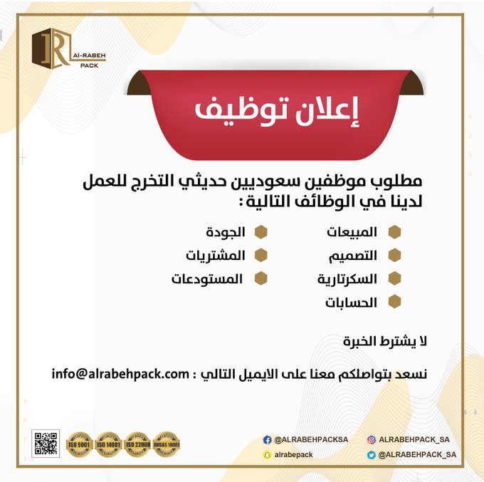 شركة الرابح للتغليف وصناعة الكرتون توفر فرص وظيفية لحديثي التخرج بمختلف التخصصات للعمل بجدة