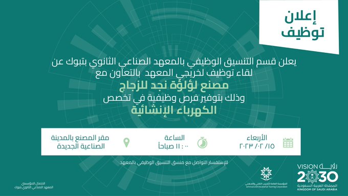 المؤسسة العامة للتدريب التقني والمهنييعلن (المعهد الصناعي الثانوي بتبوك) عبر حسابه الرسمي (تويتر) عن توفر فرص وظيفية للخريجين للعمل في تخصص (الكهرباء الإنشائية) للعمل في (مصنع لؤلؤة نجد للزجاج)، وذلك وفقاً للتفاصيل والشروط الآتية.