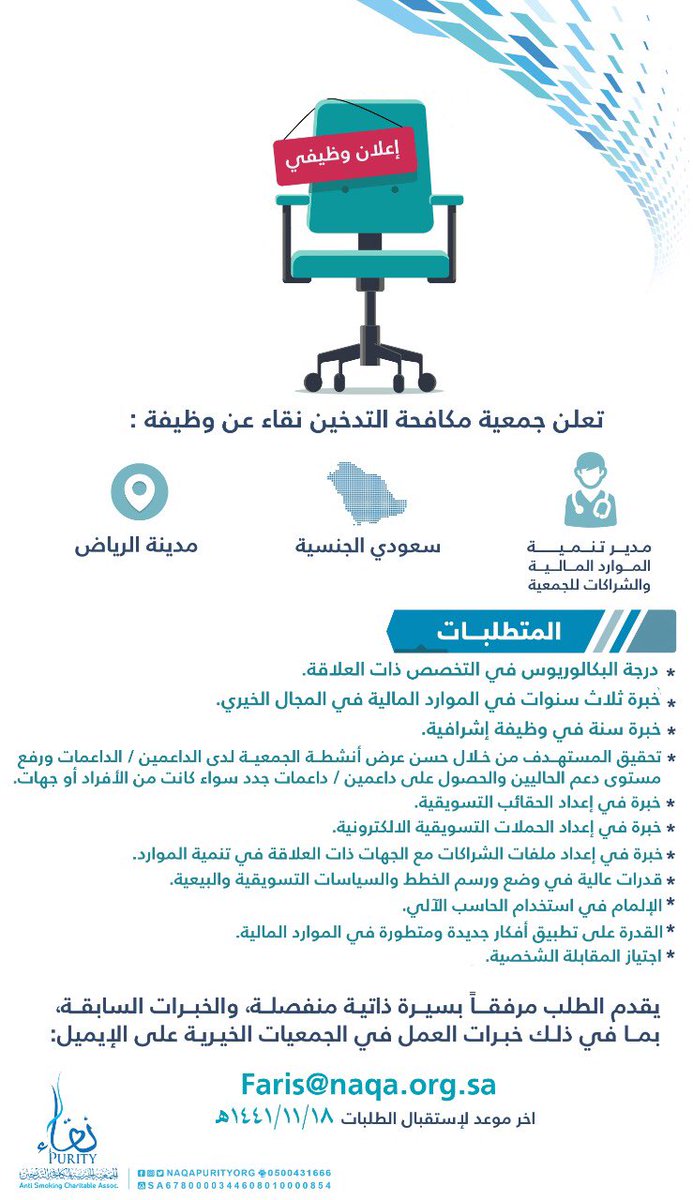 يقدم الطلب مرفقاً بسيرة ذاتية منفصلة، والخبرات السابقة، بما في ذلك خبرات العمل في الجمعيات الخيرية على الإيميل: