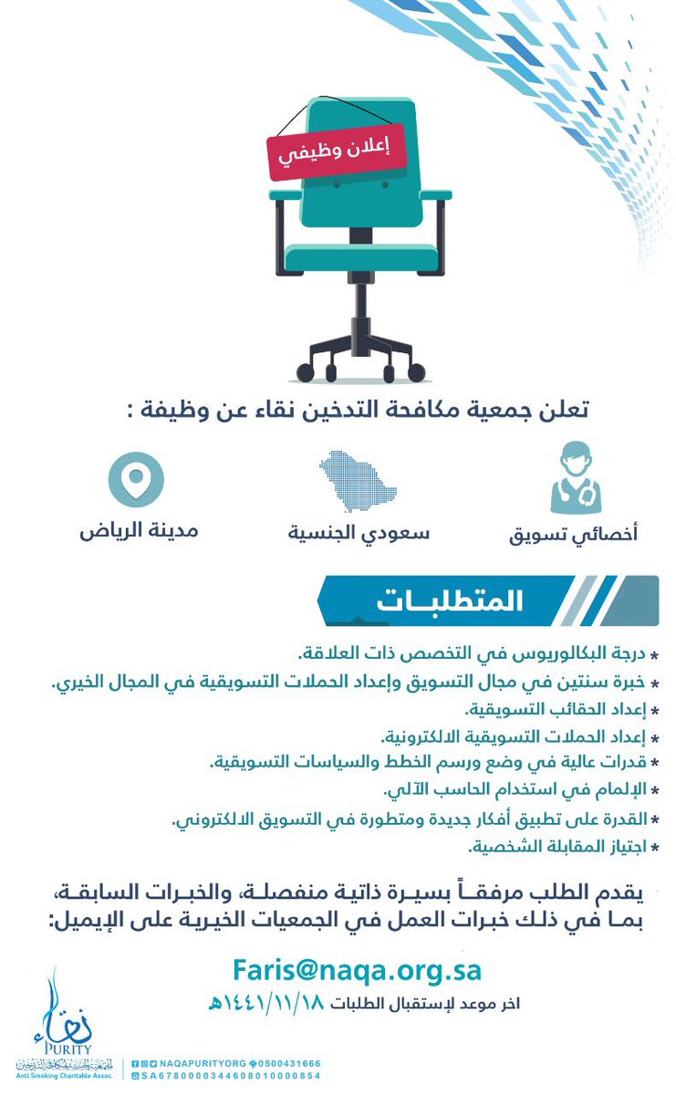 جمعية نقاء تعلن عن توفر وظائف إدارية لحملة البكالوريوس بالرياض