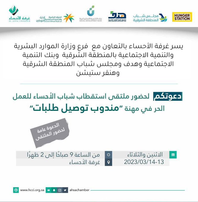 وظيفتك عليناتعلن (غرفة الأحساء) عبر حسابها الرسمي (تويتر) بالتعاون مع عدة جهات (وزارة الموارد البشرية والتنمية الاجتماعية، وبنك التنمية الاجتماعية، وهدف، ومجلس شباب المنطقة الشرقية)عن إقامة ملتقى استقطاب شباب الأحساء للعمل الحر في مهنة (مندوب توصيل طلبات) لحملة جمع المؤهلات للعمل في (المنطقة الشرقية)، وذلك وفقاً للتفاصيل والشروط الآتية.