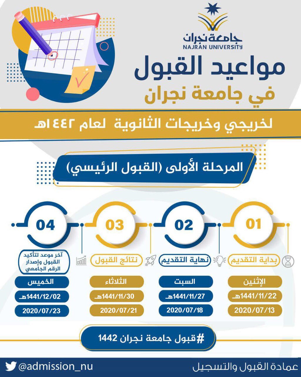 - آخر موعد لتأكيد القبول وإصدار الرقم الجامعي يوم الخميس 2-12-1441هـ .