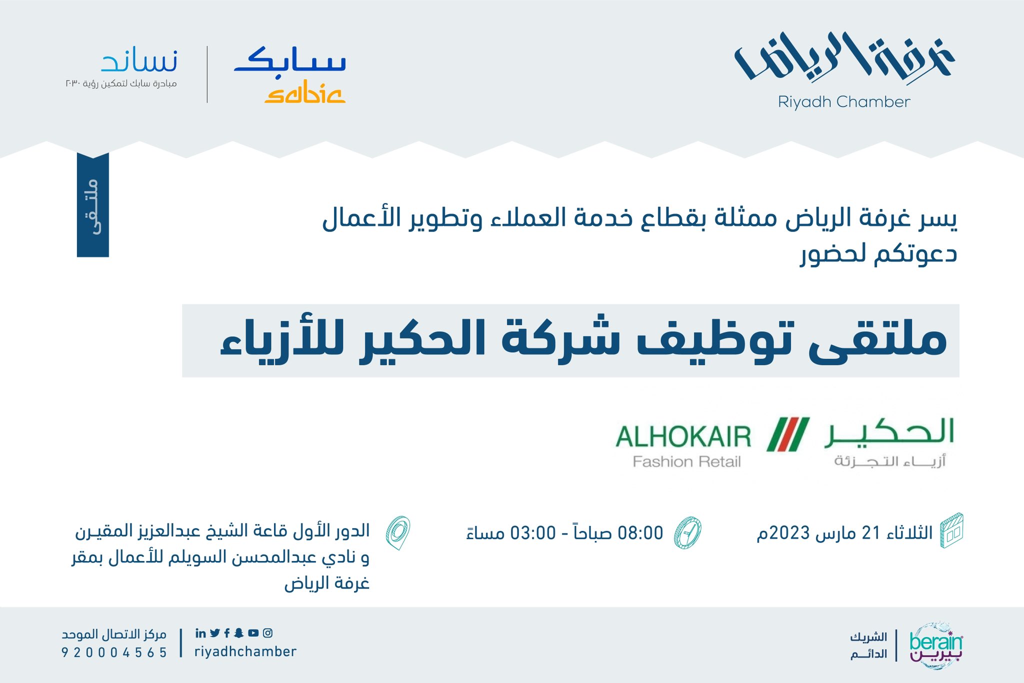 شركة الحكير للأزياء تعلن إقامة ملتقى التوظيف رجال ونساء بالتعاون مع غرفة الرياض