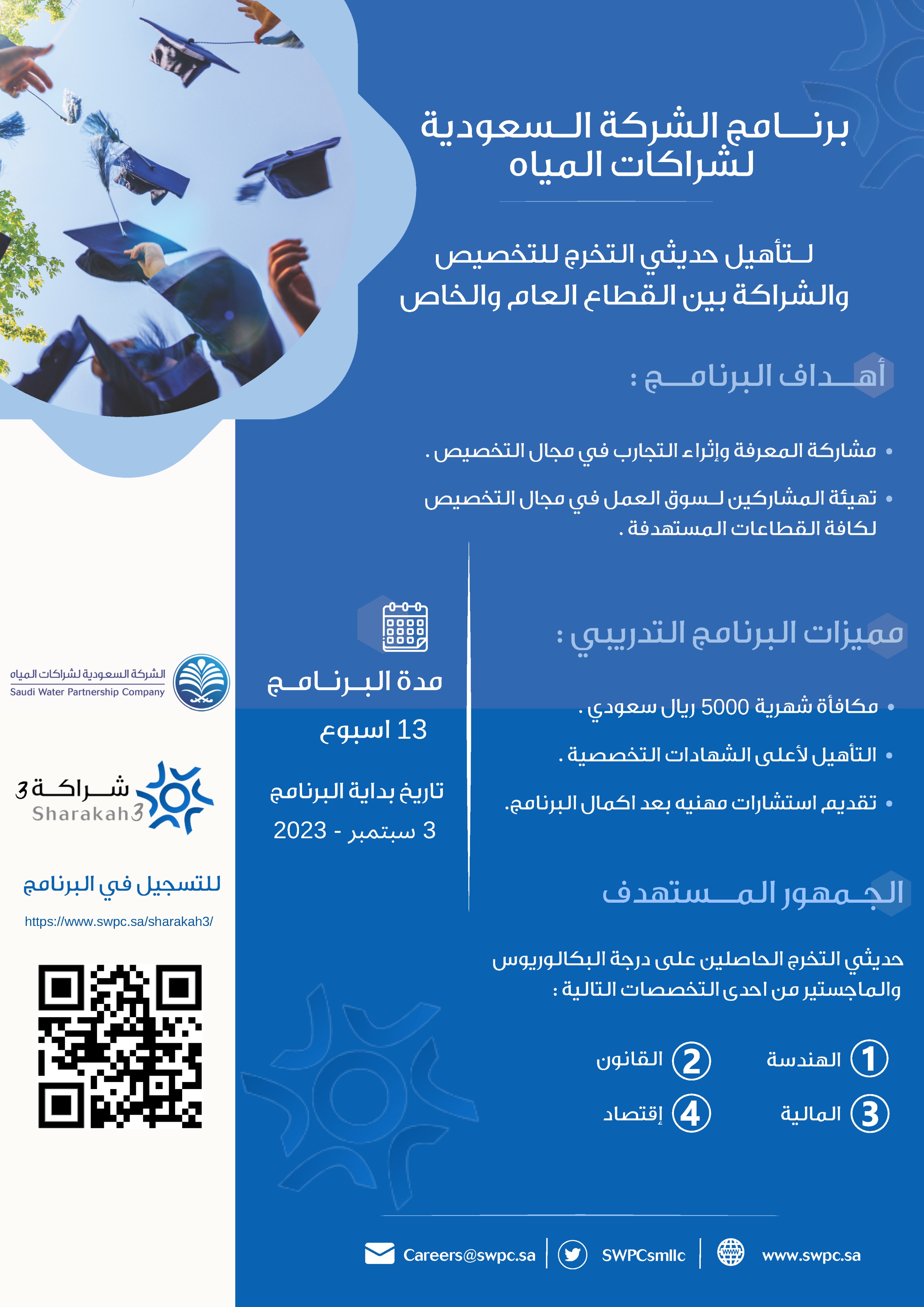 الشركة السعودية لشراكات المياهتعلن (الشركة السعودية لشراكات المياه) عبر حسابها الرسمي (تويتر) عن بداية التسجيل في إحدى برامجها التنموية برنامج (شراكة3) في نسخته الثالثة والذي يستهدف حديثي التخرج وذلك لتأهيلهم للتخصيص والشراكة بين القطاع العام والخاص، وذلك وفقاً للتفاصيل والشروط الآتية.