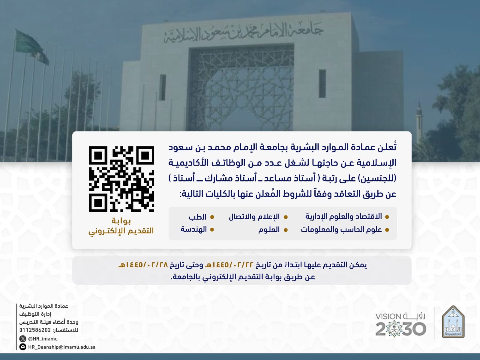 جامعة الإمام تعلن توفر وظائف أكاديمية للرجال والنساء بمختلف التخصصات عن طريق التعاقد
