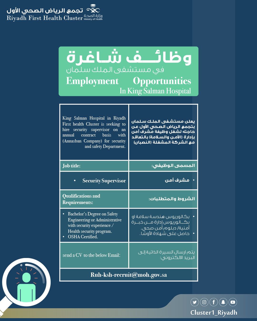 مستشفى الملك سلمان عضو تجمع الرياض الصحي الأول يعلن عن توفر وظيفة أمنية لحملة الدبلوم فأعلى