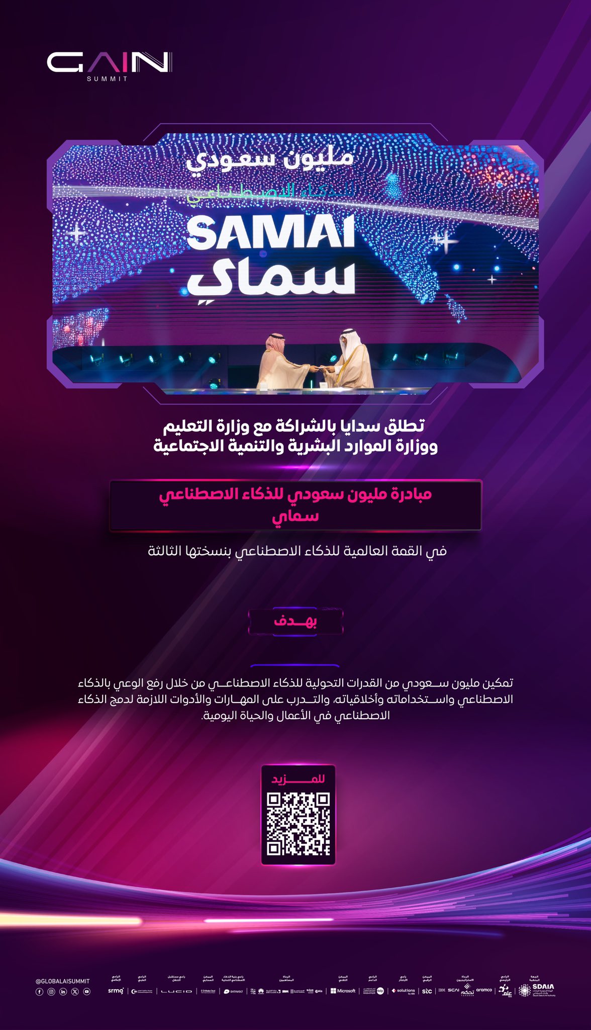 وزارة التعليمتعلن (وزارة التعليم) بالشراكة الهيئة السعودية للبيانات والذكاء الاصطناعي (سدايا) ووزارة الموارد البشرية والتنمية الاجتماعية عن إطلاق مبادرة مليون سعودي للذكاء الاصطناعي (سماي) التي تهدف إلى تمكين مليون سعودي في مجال الذكاء الاصطناعي، وذلك وفقاً للتفاصيل والشروط الآتية.