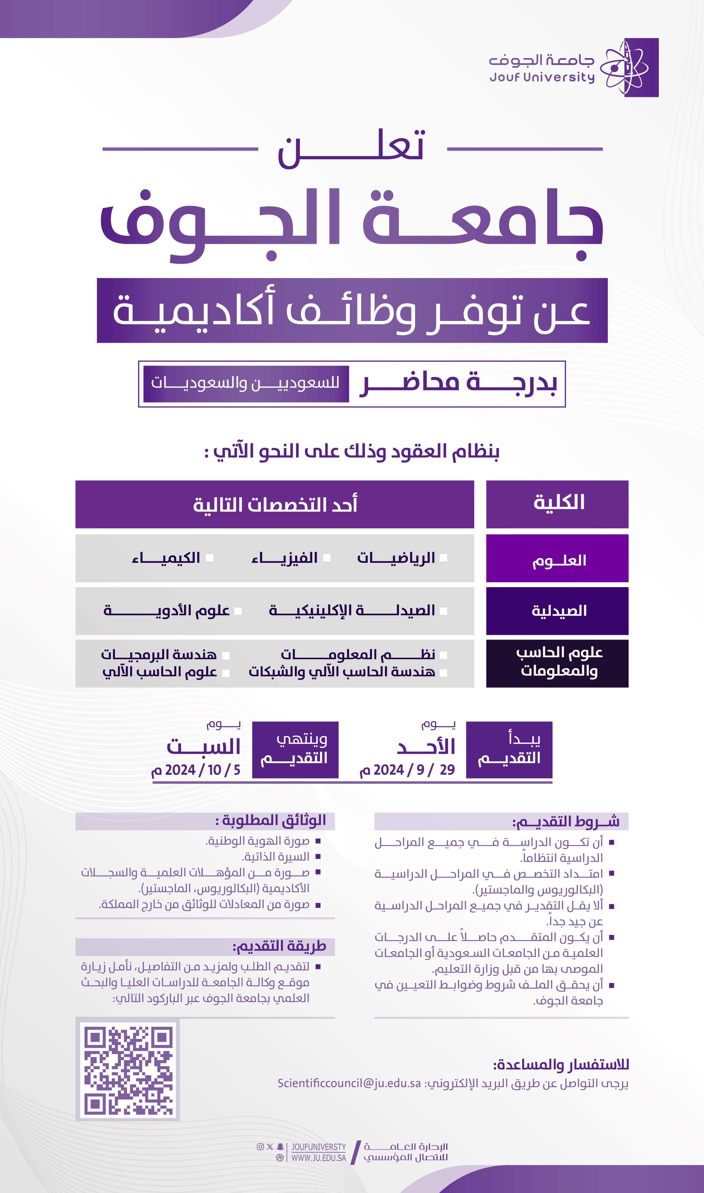 جامعة الجوف تعلن عن وظائف أكاديمية بدرجة محاضر في عدد من التخصصات بنظام العقود