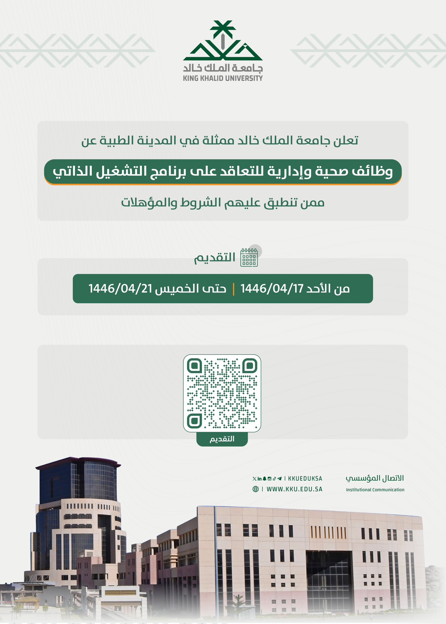 جامعة الملك خالد تعلن عن توفر وظائف صحية وإدارية للتعاقد على برنامج التشغيل الذاتي