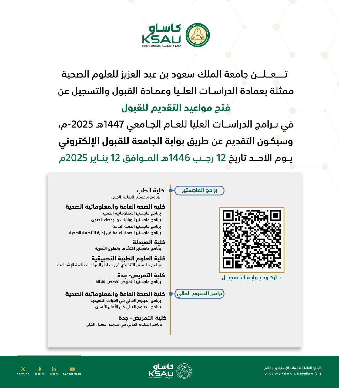 جامعة الملك سعود للعلوم الصحية تعلن مواعيد التقديم على برامج الماجستير والدبلوم العالي 1447هـ