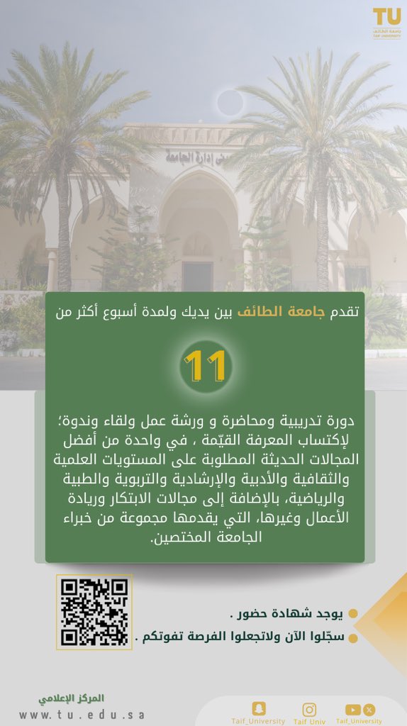 جامعة الطائف تعلن عن أكثر من 11 دورة تدريبية مجانية عن بعد لجميع أفراد المجتمع