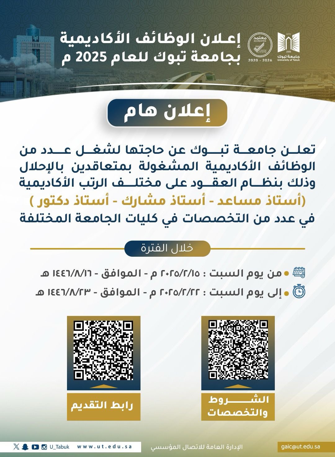 جامعة تبوكتعلن (جامعة تبوك) عبر حسابها الرسمي (تويتر) عن توفر وظائف أكاديمية بدرجة (أستاذ مساعد - أستاذ مشارك - أستاذ) للجنسين المشغولة بمتعاقدين (بالإحلال) وذلك بنظام العقود على مختلف الرتب الأكاديمية (أستاذ مساعد - أستاذ مشارك- أستاذ دكتور) في عدد من التخصصات في كليات الجامعة المختلفة، وذلك وفقاً للتفاصيل والشروط الآتية.