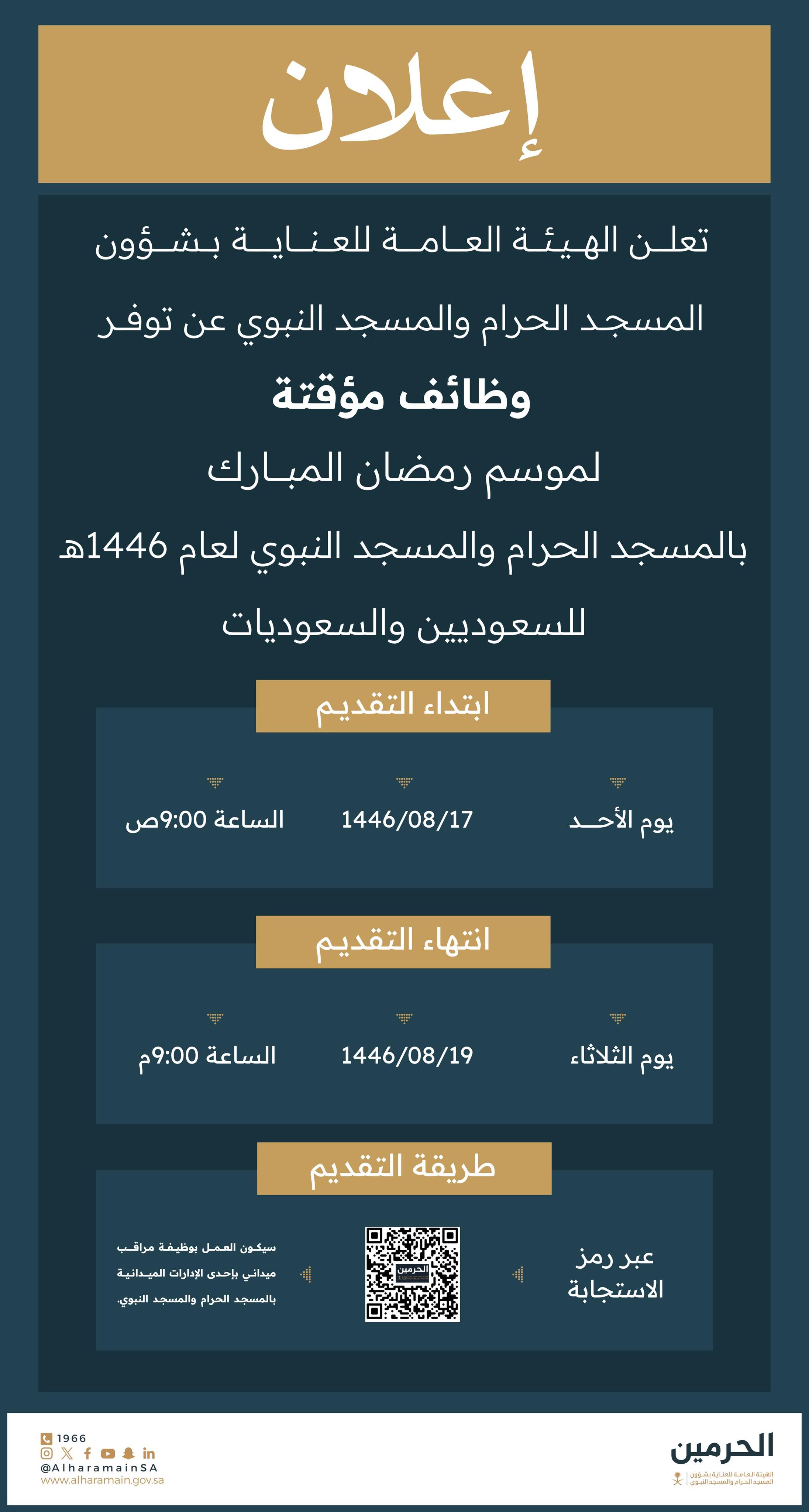 الهيئة العامة للعناية بشوؤن الحرمين الشريفين توفر وظائف موسمية لموسم رمضان المبارك
