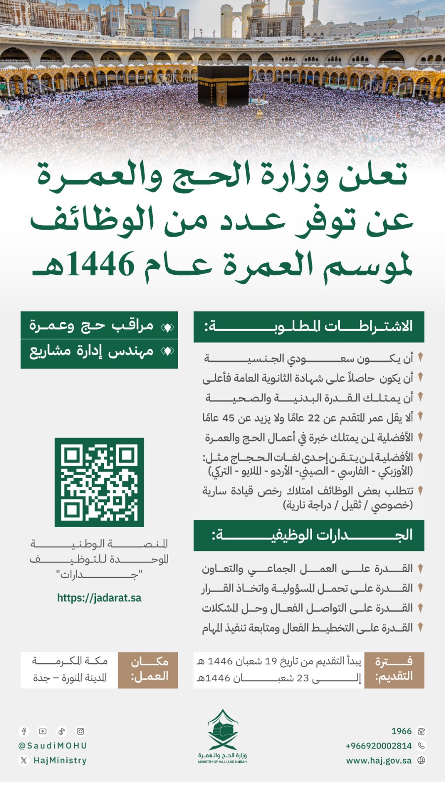 وزارة الحج والعمرةتعلن (وزارة الحج والعمرة) عن 200 وظيفة موسمية لموسم العمرة 1446هـ بمسمى مراقب خدمات ومهندس إدارة المشاريعلحملة (الثانوية فأعلى) عبر المنصة الوطنية الموحدة للتوظيف (جدارات)، وذلك وفقاً للتفاصيل والشروط الآتية.