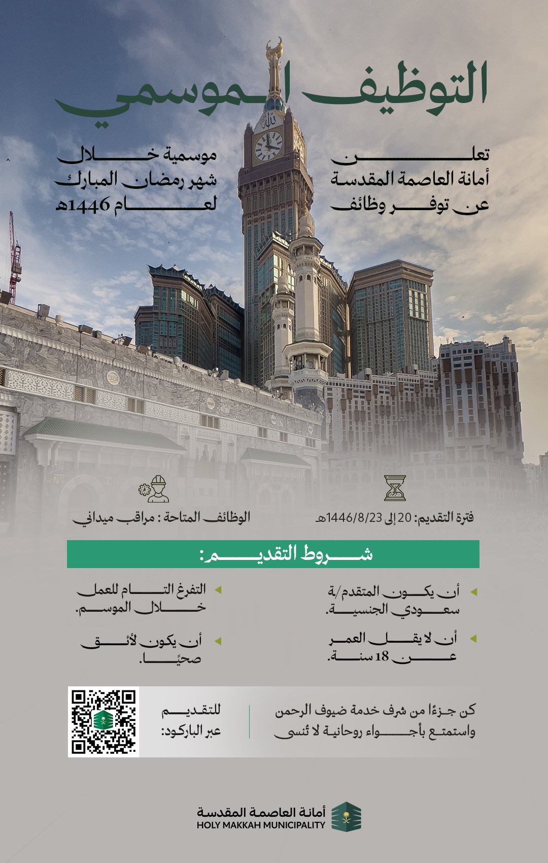 أمانة العاصمة المقدسة تعلن عن وظائف موسمية خلال شهر رمضان المبارك 1446هـ
