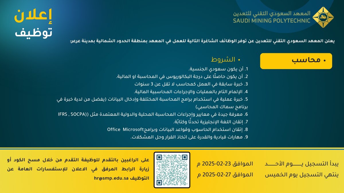 المعهد السعودي التقني للتعدينيعلن (المعهد السعودي التقني للتعدين) عبر حسابه الرسمي (تويتر) عن توفر وظيفة إدارية لحملة الشهادة الجامعية بمنطقة الحدود الشمالية في (عرعر)، وذلك وفقاً للتفاصيل والشروط الآتية.