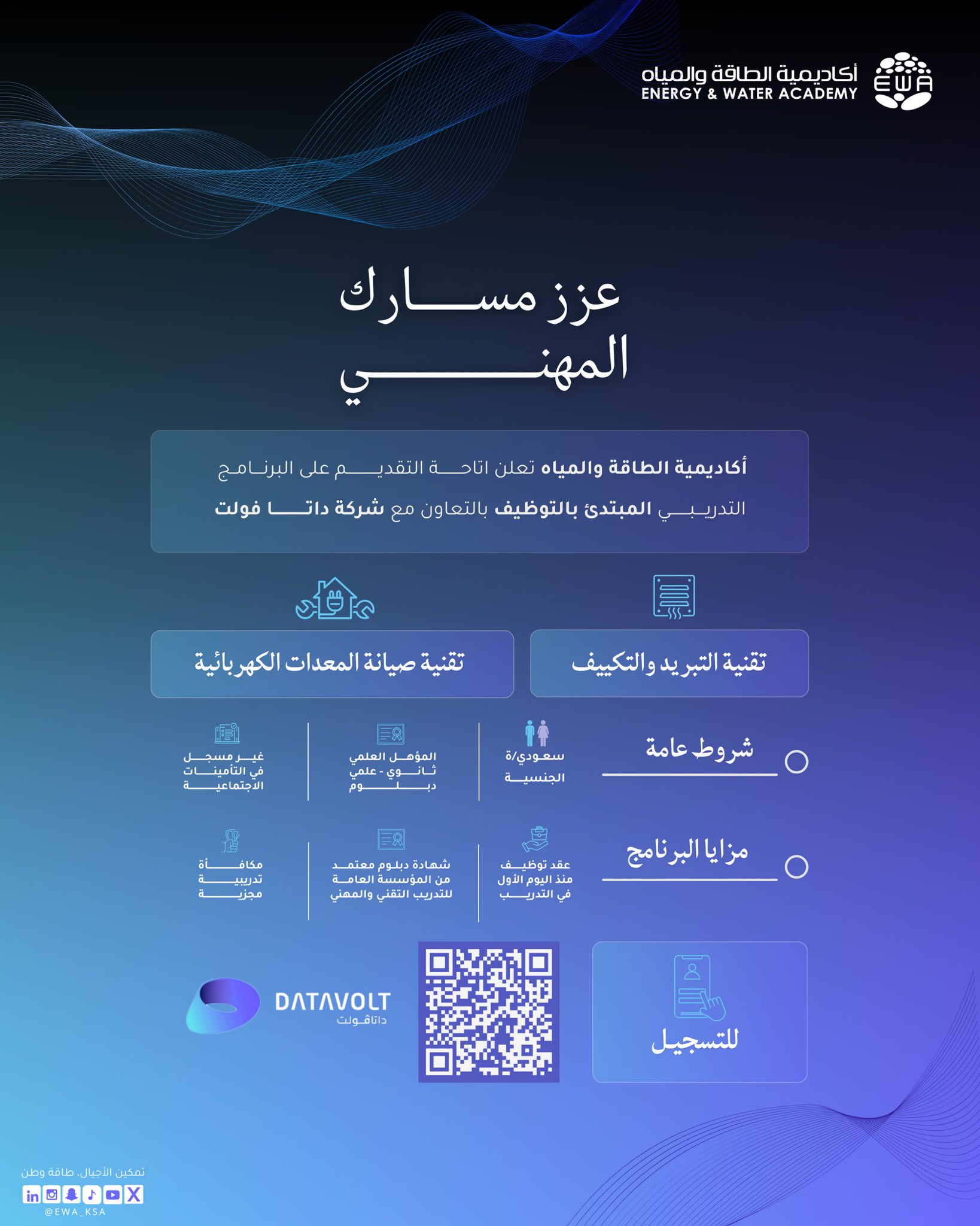 أكاديمية الطاقة والمياهتعلن (أكاديمية الطاقة والمياه) عبر حسابها الرسمي (تويتر) عن بدء التسجيل في برنامج التدريب المبتدئ بالتوظيف بالتعاون مع داتا فولت، وبدعم واعتماد من صندوق تنمية الموارد البشرية (هدف) والتدريب التقني، وذلك وفقاً للتفاصيل والشروط الآتية