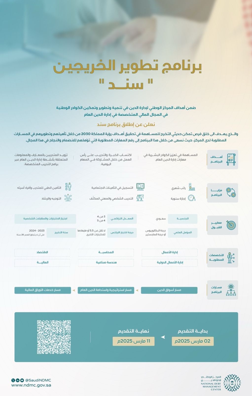 المركز الوطني لإدارة الدينيعلن (المركز الوطني لإدارة الدين العام) عبر موقع التوظيف (لينكد إن) عن بدء التقديم على برنامج تطوير الخريجين (سند) في عدد من التخصصات، وذلك وفقاً للتفاصيل والشروط الآتية.