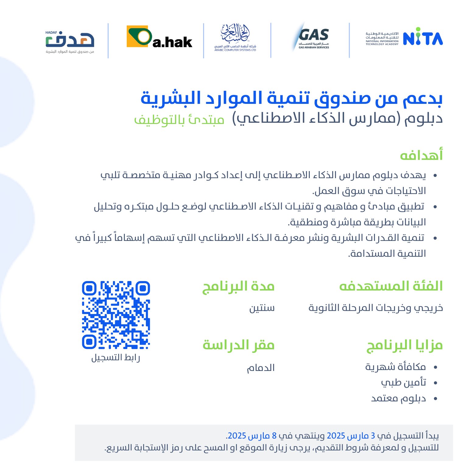 الأكاديمية الوطنية لتقنية المعلوماتتعلن (الأكاديمية الوطنية لتقنية المعلومات) عبر حسابها الرسمي (تويتر) عن بدء التسجيل في برنامج دبلوم ممارس الذكاء الإصطناعي المبتدئ بالتوظيف لحملة شهادة المرحلة الثانوية، وذلك وفقاً للتفاصيل والشروط الآتية.