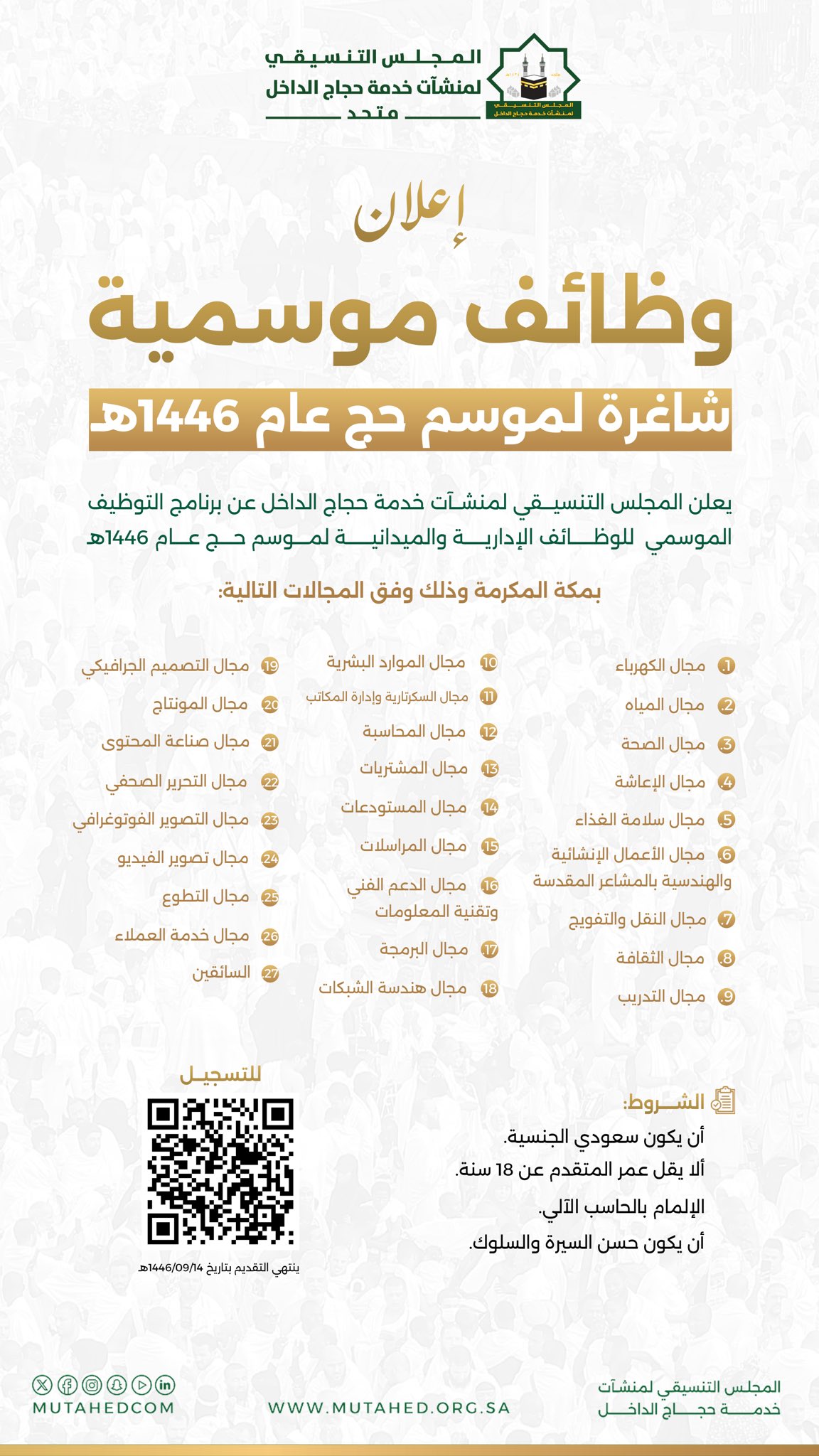 المجلس التنسيقي لمؤسسات وشركات خدمة حجاج الداخليعلن (المجلس التنسيقي لمنشآت خدمة حجاج الداخل (متحد)) عبر حسابه الرسمي (تويتر) عن فتح باب التقديم على الوظائف الموسمية الإدارية والميدانية لموسم حج عام 1446هـ في مكة المكرمة، وذلك وفقاً للتفاصيل والشروط الآتية.