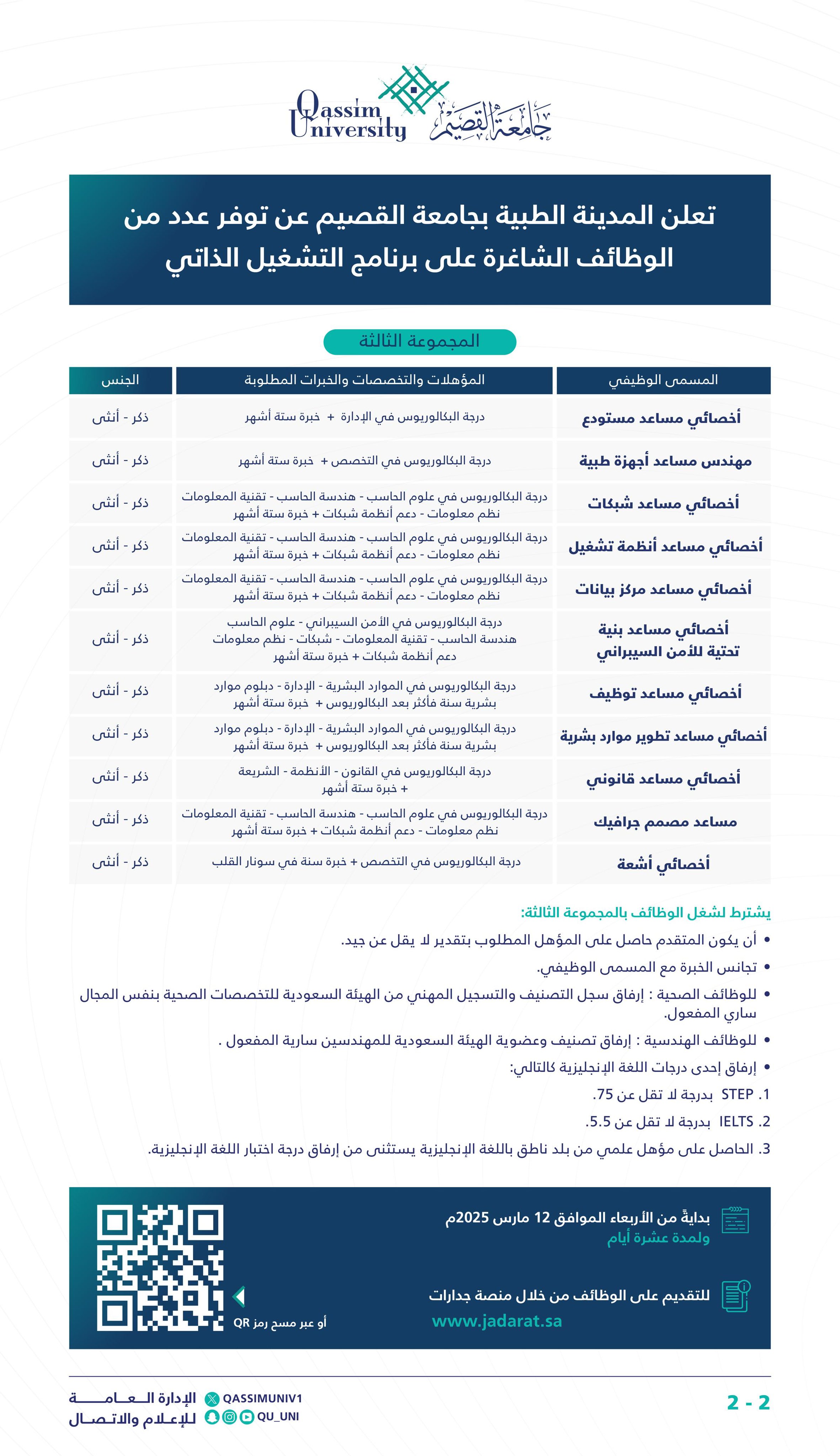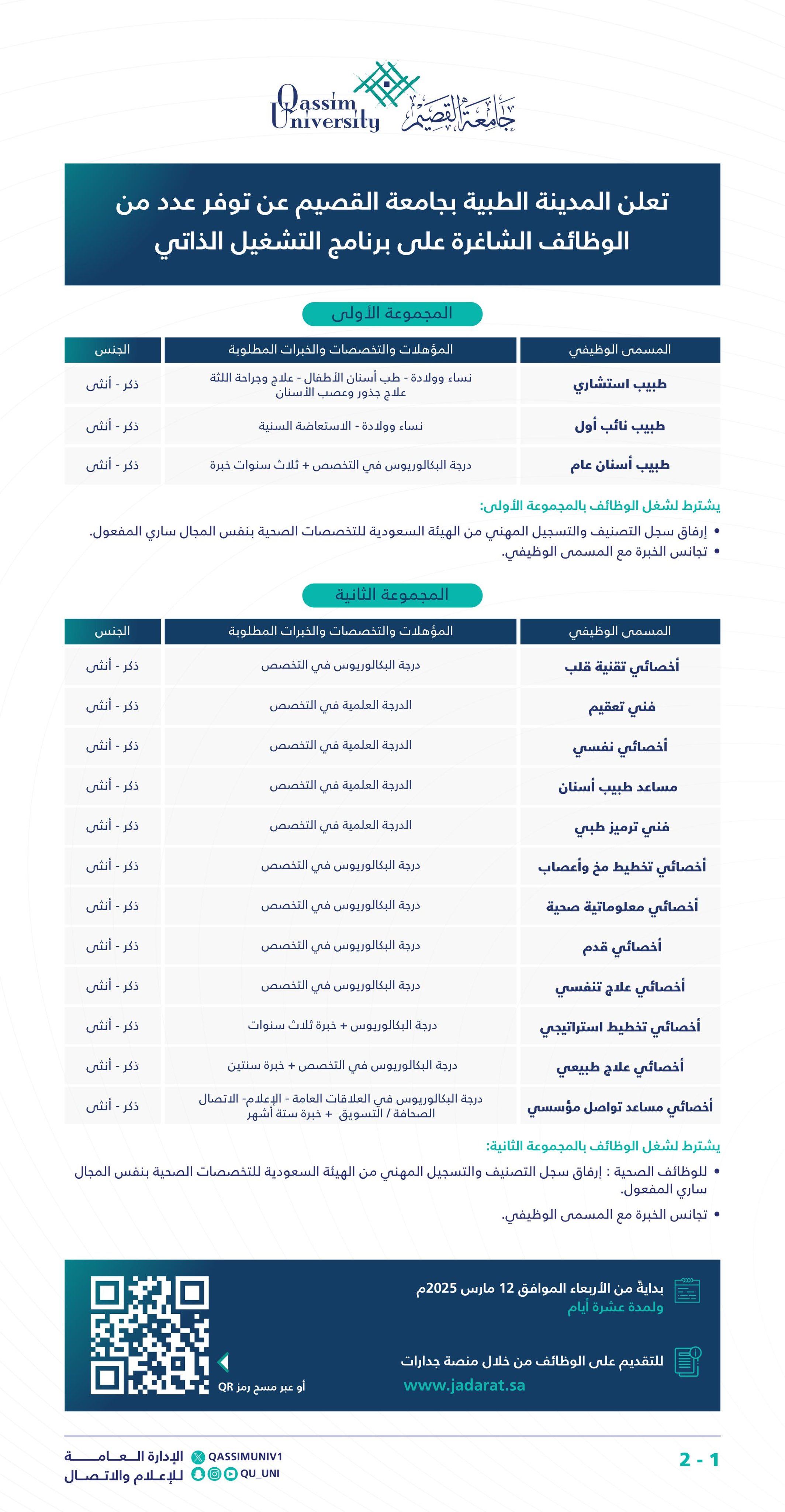 جامعة القصيمتعلن (جامعة القصيم) عبر حسابها الرسمي (تويتر) عن حاجتها لشغل عدد من الوظائف على برنامج التشغيل الذاتي لحملة (مختلف المؤهلات) من الجنسين للعمل في المدينة الطبية في عدة تخصصات، وذلك وفقاً للتفاصيل والشروط الآتية.