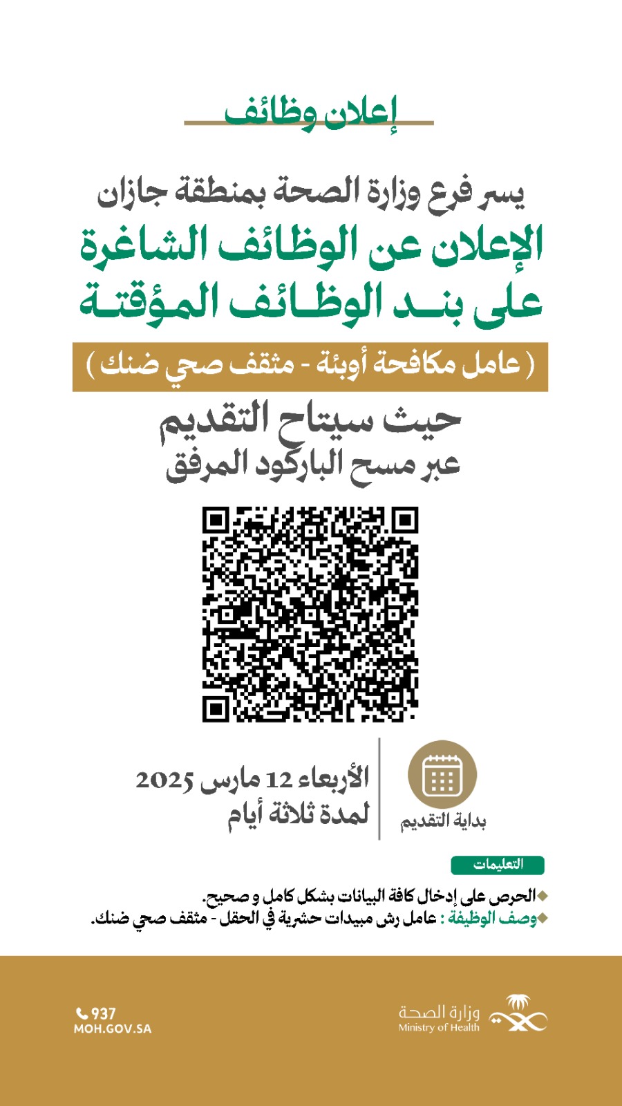 تعلن (وزارة الصحة) على بند الوظائف المؤقته، وذلك وفقاً للتفاصيل والشروط الآتية.