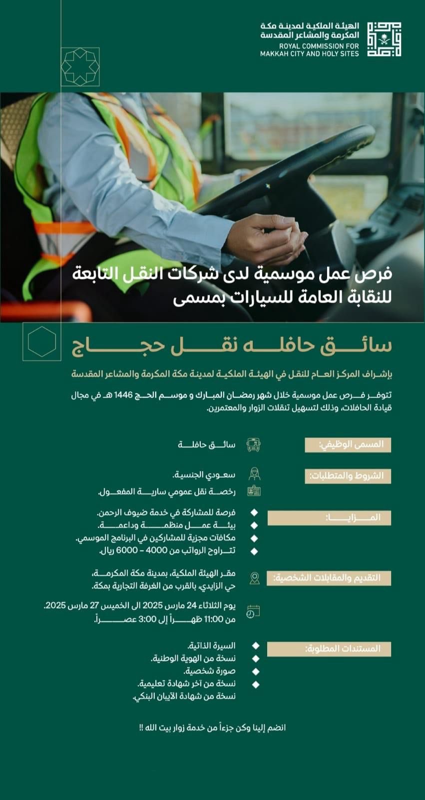 الهيئة الملكية لمدينة مكة المكرمة والمشاعر المقدسةتعلن (الهيئة الملكية لمدينة مكة المكرمة والمشاعر المقدسة) عن توفر فرص عمل موسمية خلال شهر رمضان المبارك وموسم الحج 1446هـ في مجال قيادة الحافلات وذلك لتسهيل تنقلات الزوار والمعتمرين لدى شركات النقل التابعة للنقابة العامة للسيارات بإشراف المركز العام للنقل في الهيئة الملكية لمدينة مكة المكرمة والمشاعر المقدسة، وذلك وفقاً للتفاصيل والشروط الآتية.