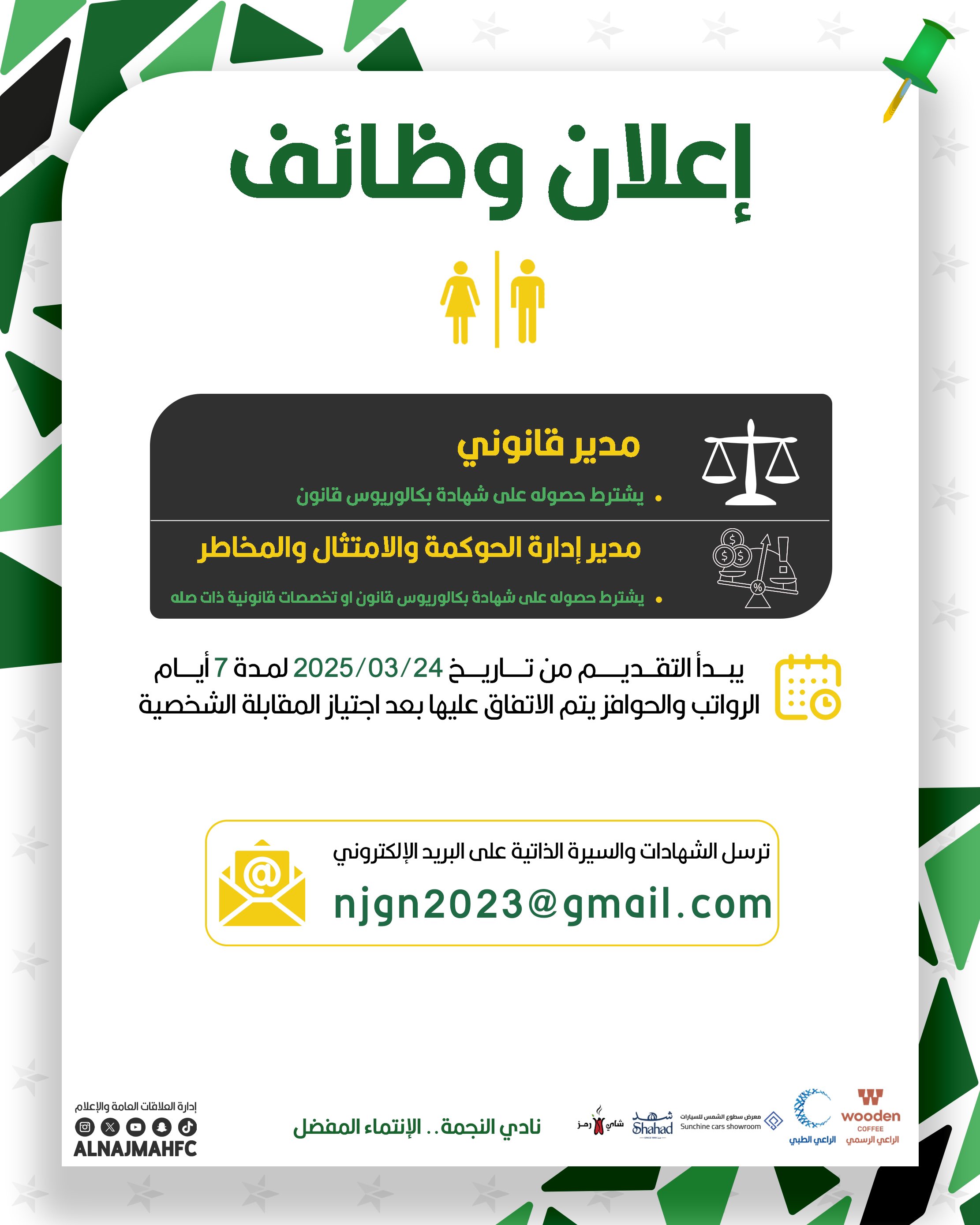 وظائف قانونية شاغرة لحملة البكالوريوس في نادي النجمة السعودي