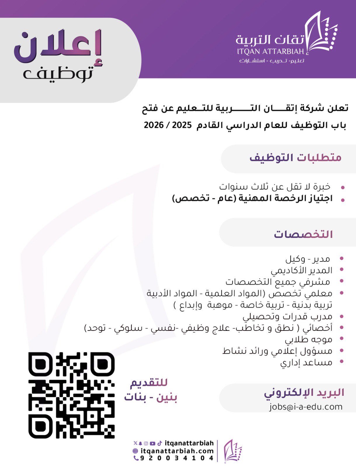 شركة إتقان التربية للتعليمتعلن (شركة إتقان التربية للتعليم) عبر حسابها الرسمي على منصة (إكس) عن فتح باب التوظيف (رجال / نساء) للعام الدراسي القادم 2025-2026م في التخصصات (الإدارية) و (التعليمية) بالرياض، وذلك وفقاً للتفاصيل والشروط الآتية.