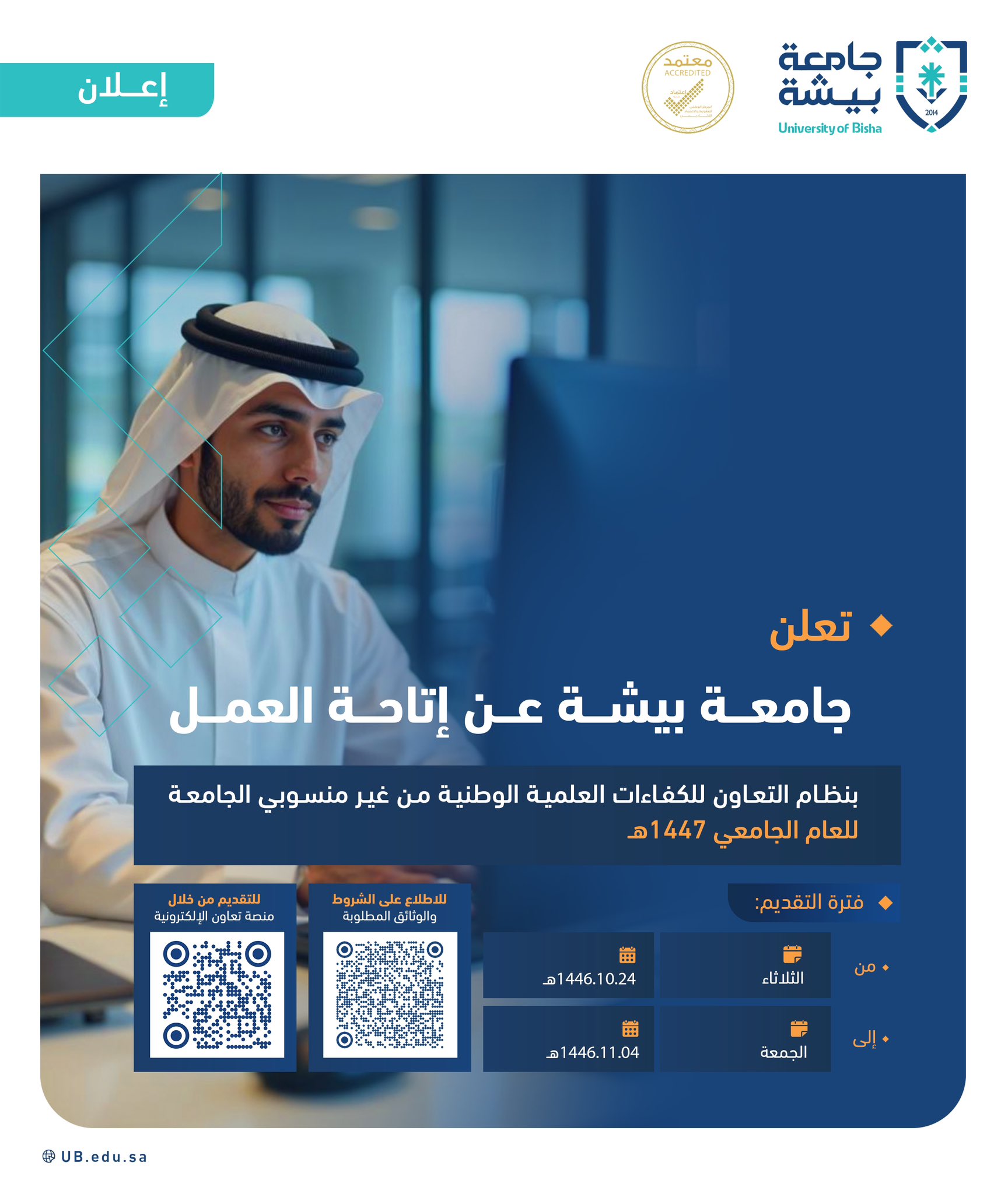 جامعة بيشةتعلن (جامعة بيشة) عبر حسابها الرسمي على منصة (إكس) عن إتاحة العمل بنظام التعاون للكفاءات العلمية الوطنية من غير منسوبي الجامعة للعام الجامعي 1447هـ، وذلك وفقاً للتفاصيل والشروط الآتية.