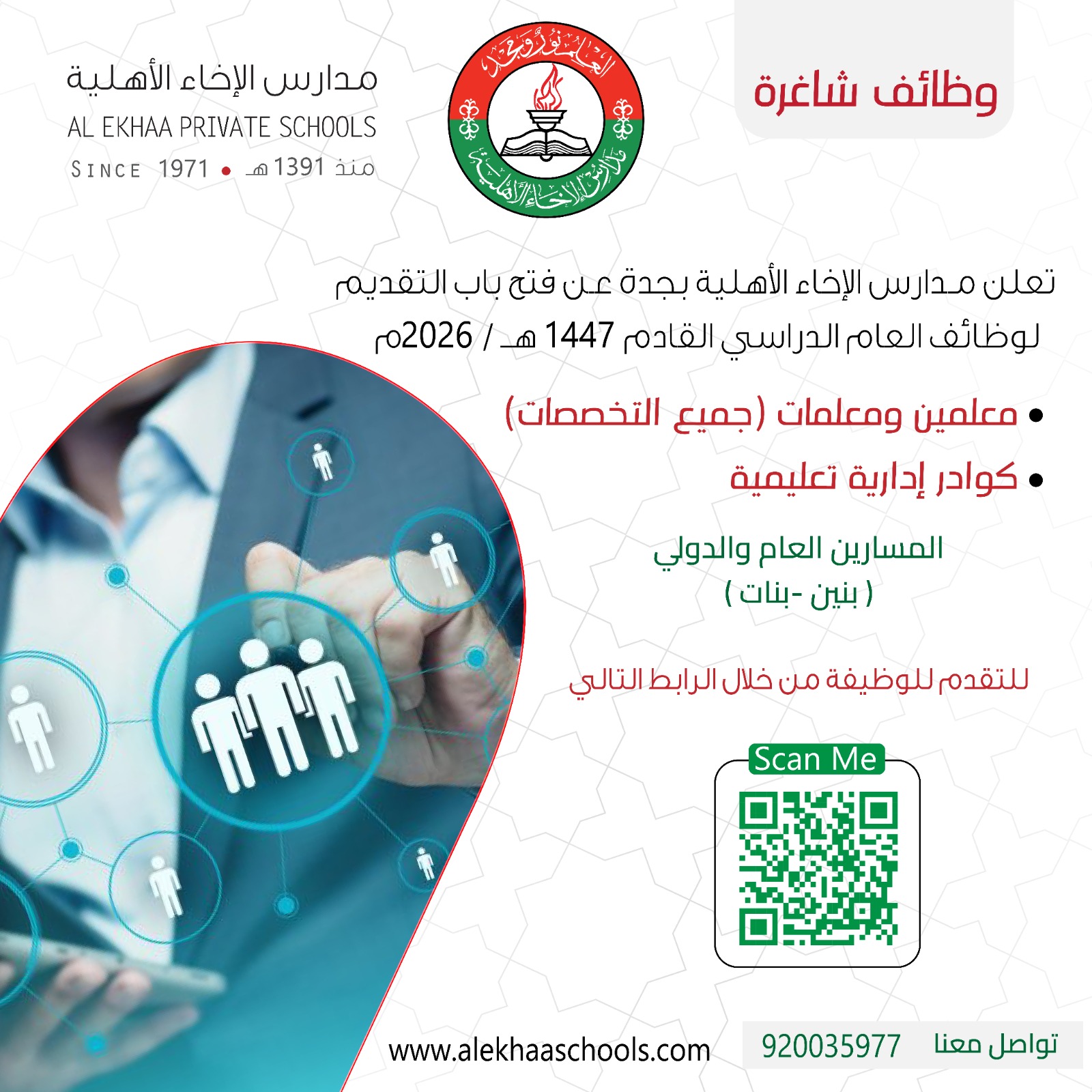 مدارس الإخاء الأهليةتعلن (مدارس الإخاء الأهلية بجدة) عبر حسابها الرسمي على منصة (إكس) عن فتح باب التقديم للوظائف التعليمية والإدارية للعام الدراسي القادم 1447هـ / 2026م في المسارين العام والدولي (بنين / بنات)، وذلك وفقاً للتفاصيل والشروط الآتية.