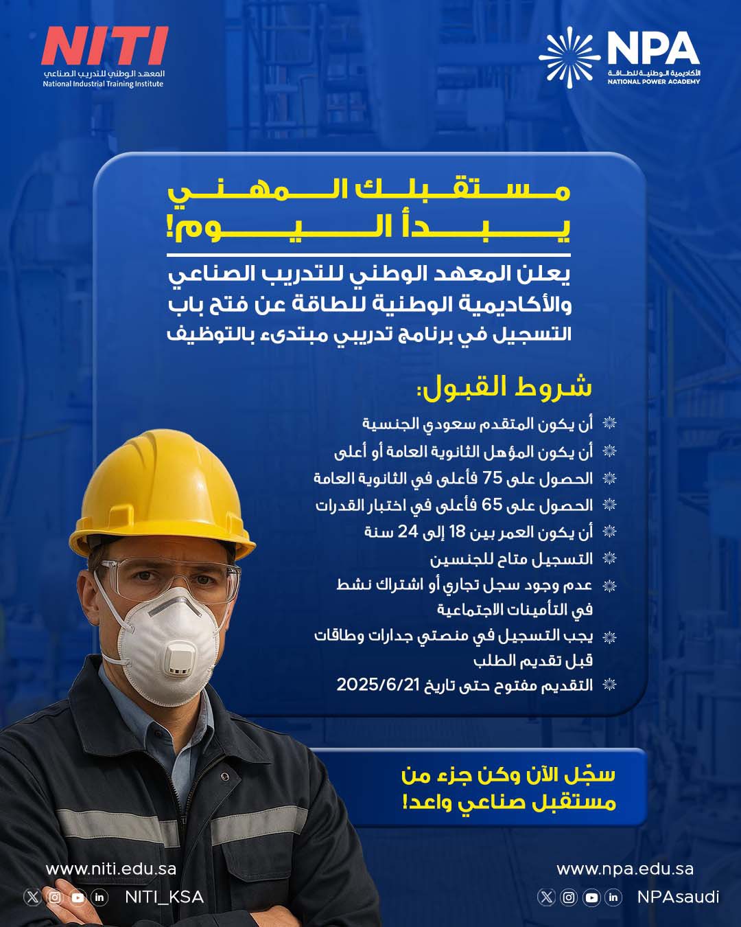 برنامج تدريب منتهي بالتوظيف لحملة الثانوية فأعلى لدى المعهد الوطني للتدريب الصناعي