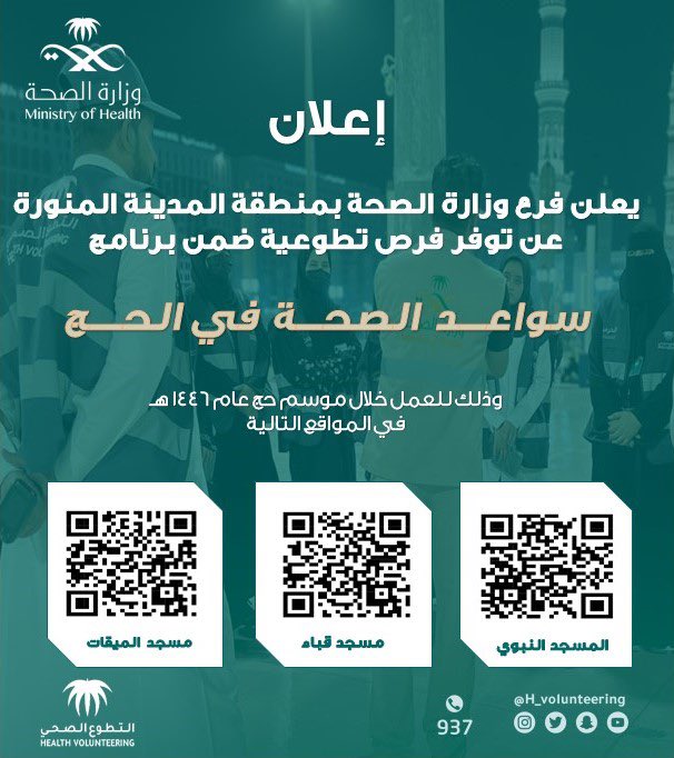 تعلن (فرع وزارة الصحة بمنطقة المدينة المنورة) عبر حسابها الرسمي على منصة (إكس) عن عدد من الفرص التطوعية الخاصة بمشروع سواعد الصحة بموسم الحج 1446هـ لخدمة حجاج بيت الله الحرام في عدة مواقع، وذلك وفقاً للتفاصيل والشروط الآتية.