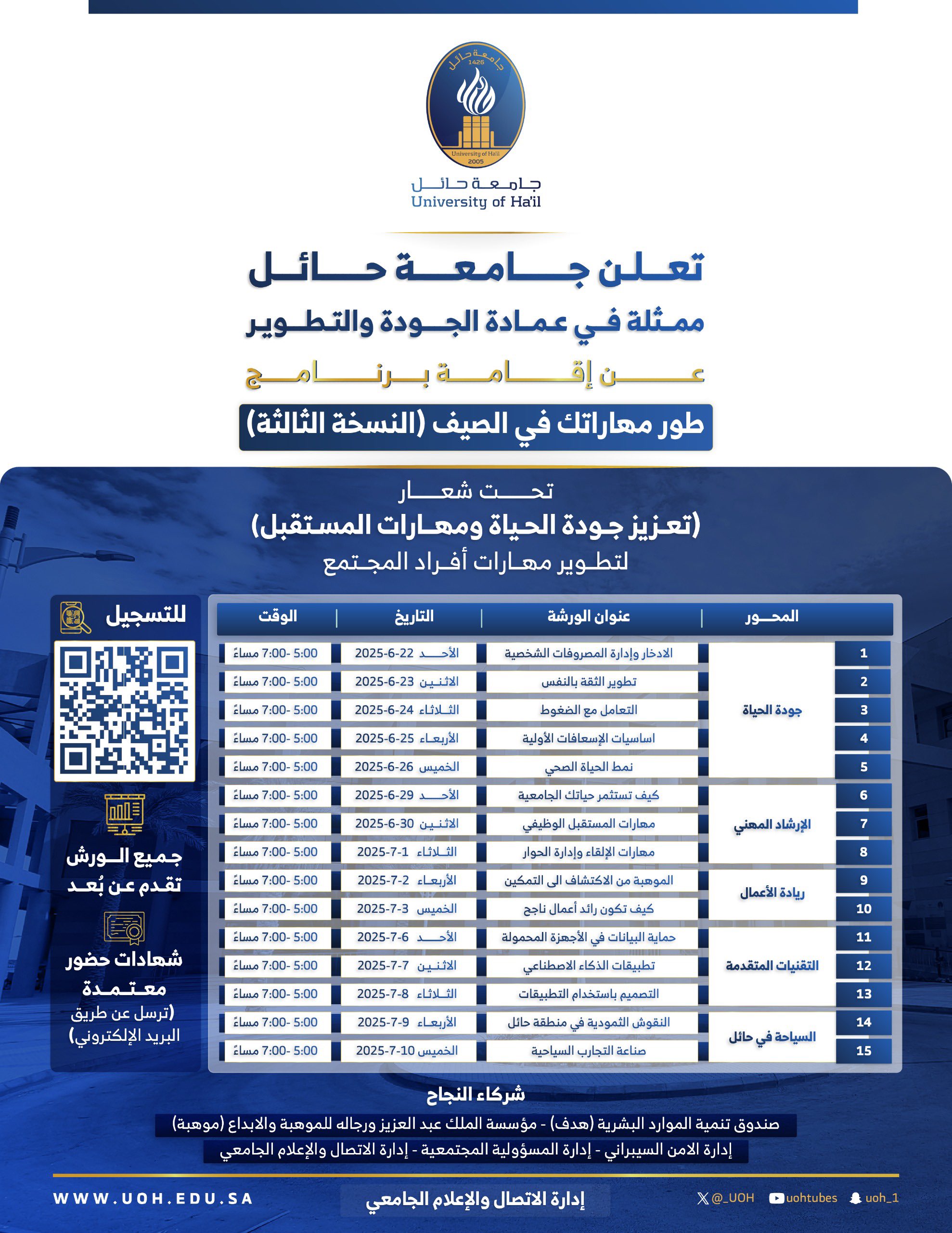 جامعة حائلتعلن (جامعة حائل) عبر حسابها الرسمي على منصة (إكس) ممثلة في عمادة الجودة والتطوير عن إقامة برنامج طور مهارات في الصيف (النسخة الثالثة) لتطوير مهارات أفراد المجتمع تحت شعار (تعزيز جودة الحياة ومهارات المستقبل)، وذلك وفقاً للتفاصيل والشروط الآتية.