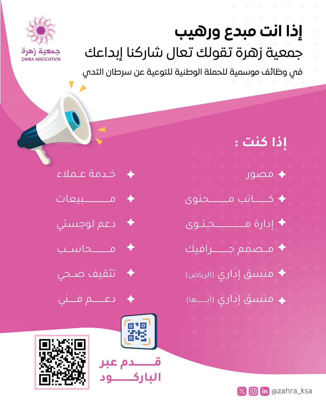 جمعية زهرة الخيرية الصحيةتعلن (جمعية زهرة) عبر حسابها الرسمي على منصة (إكس) عن توفر وظائف موسمية للحملة الوطنية للتوعية عن سرطان الثدي، وذلك وفقاً للتفاصيل والشروط الآتية.