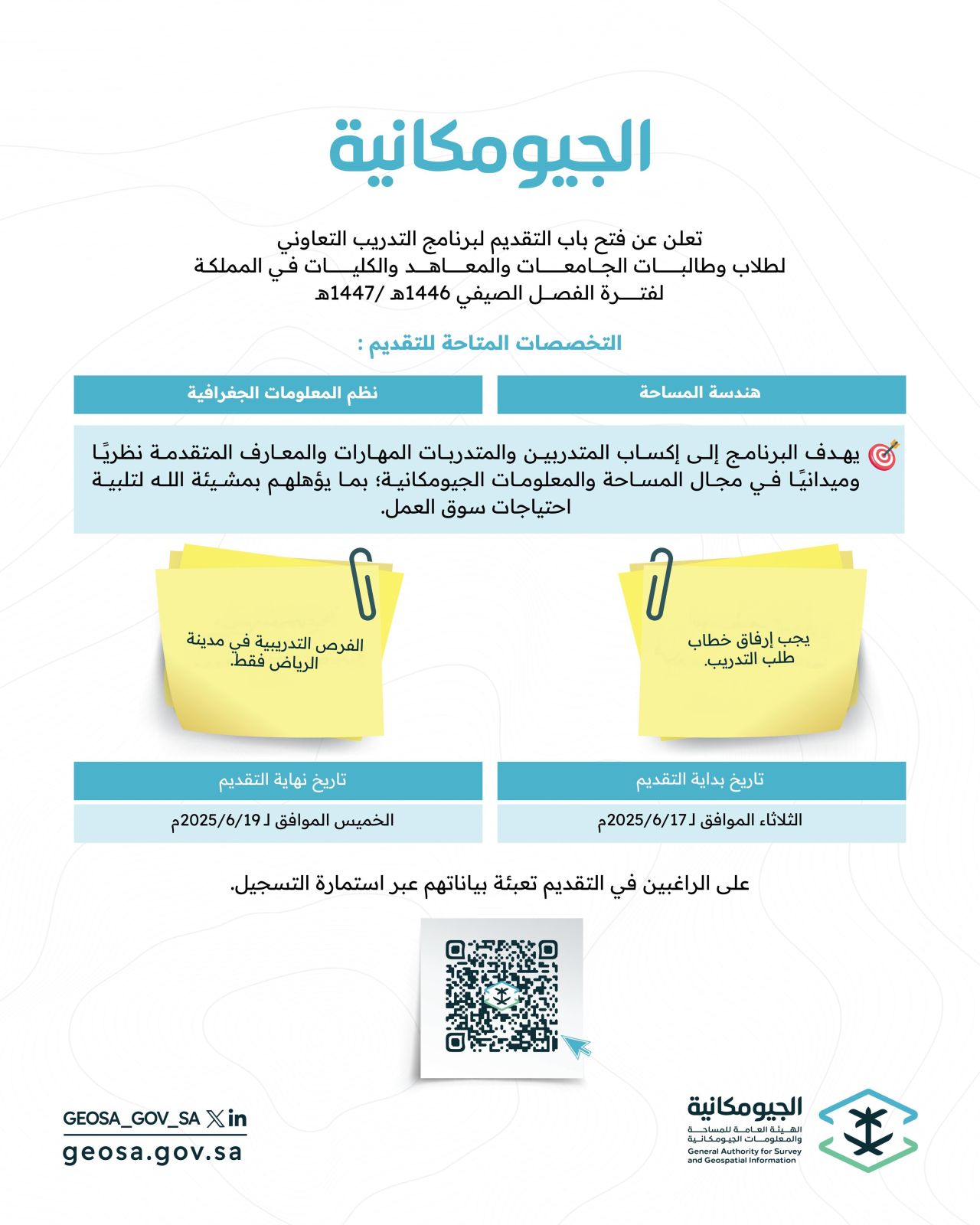 الهيئة العامة للمساحة والمعلومات الجيومكانيةتعلن (الهيئة العامة للمساحة والمعلومات الجيومكانية) عبر حسابها الرسمي على منصة (لينكد إن) عن فتح باب التقديم لبرنامج التدريب التعاوني لطلاب وطالبات الجامعات والمعاهد والكليات في المملكة لفترة الفصل الصيفي 1446هـ/1447هـ، وذلك وفقاً للتفاصيل والشروط الآتية.