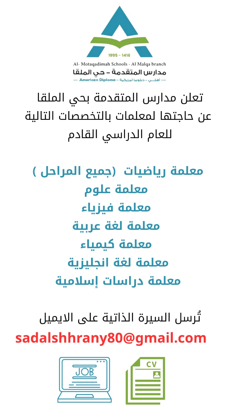 وظائف تعليمية نسائية بعدد من التخصصات للعام القادم في مدارس المتقدمة